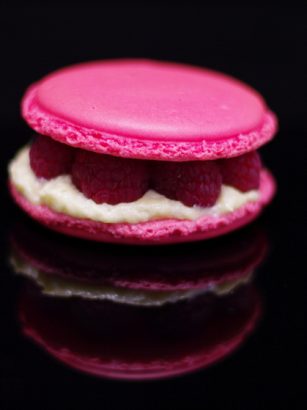 Recouvrez la base de crème à la de roses à l’aide d’une poche à douille.Placer les framboises en couronne en périphérie du macaron puis déposer des litchis bien égouttés au centre. Poser ensuite un deuxième macaron sur le dessus.