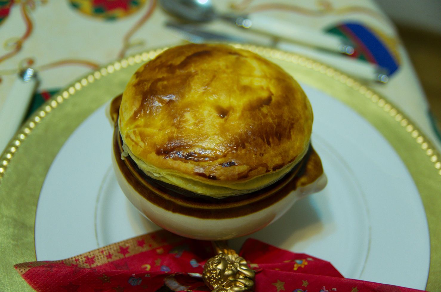 - Découper des cercles de pâte légèrement plus grand que le diamètre du récipient et les utiliser pour bien fermer les mini soupières.