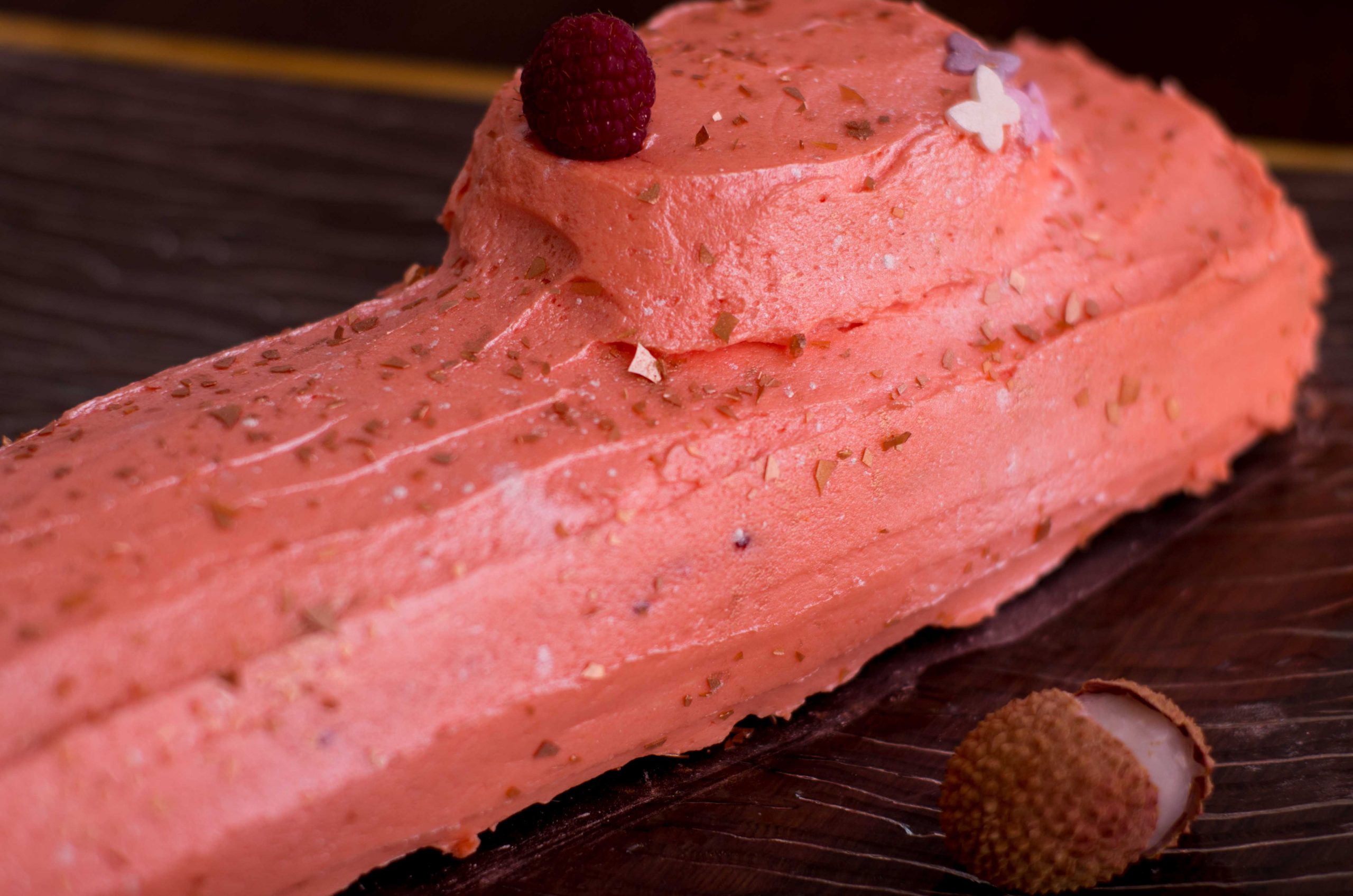 - une fois la bûche formée l’arroser de nouveau avec le sirop des litchis.